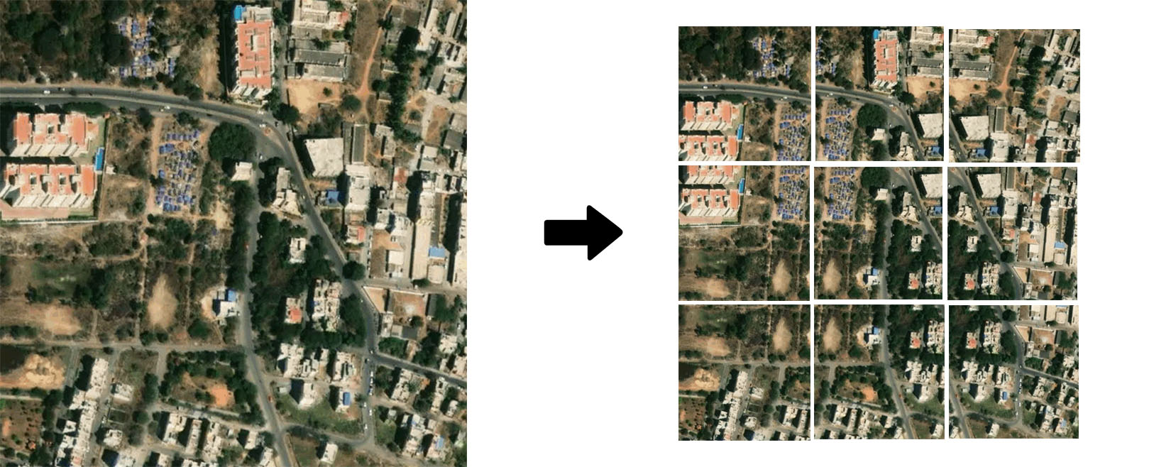 We need our input images to be 224 x 224 x 3 (We will go into details about in a bit) and the images we get from the Mapbox API call are of the dimension 600 x 600 x 3. We use the overlapping sliding window approach and split the image into 9 images of the required size. The image below tries to represent how this ‘splitting’ works.